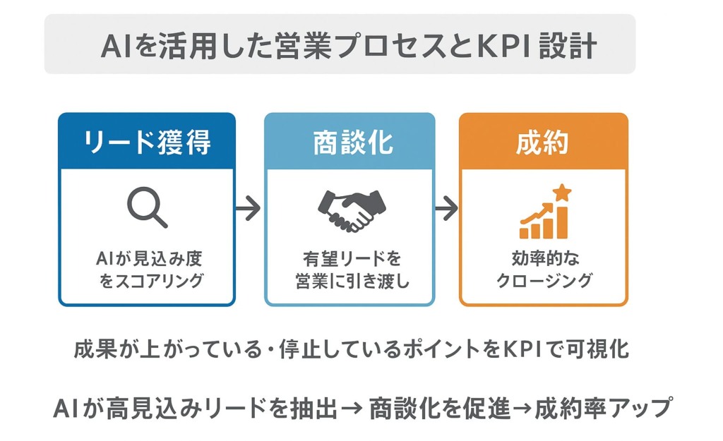 AIを活用する営業チームでは、「リード獲得 → 商談化→ 成約」の流れでつなぎを可視化し、どの段階で成果が上がっているのか、停止しているのかを明確にする KPIの設計 が重要です。